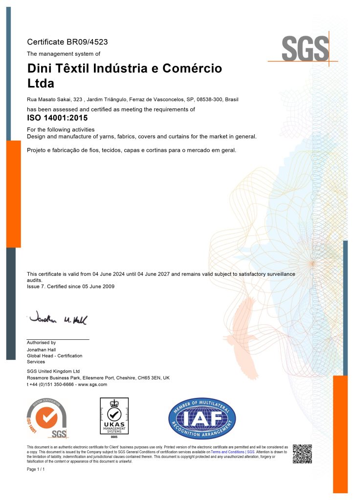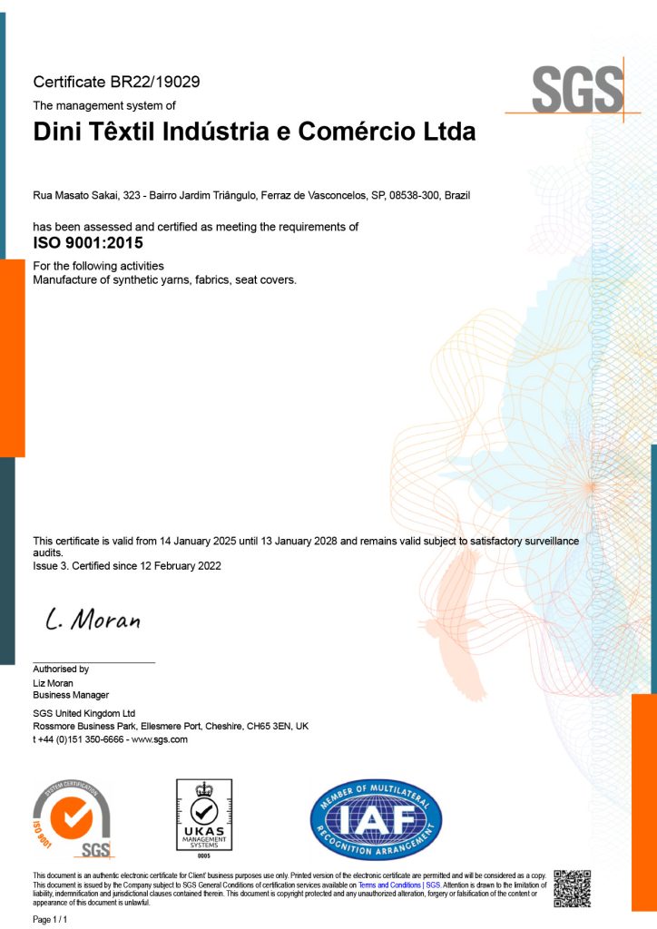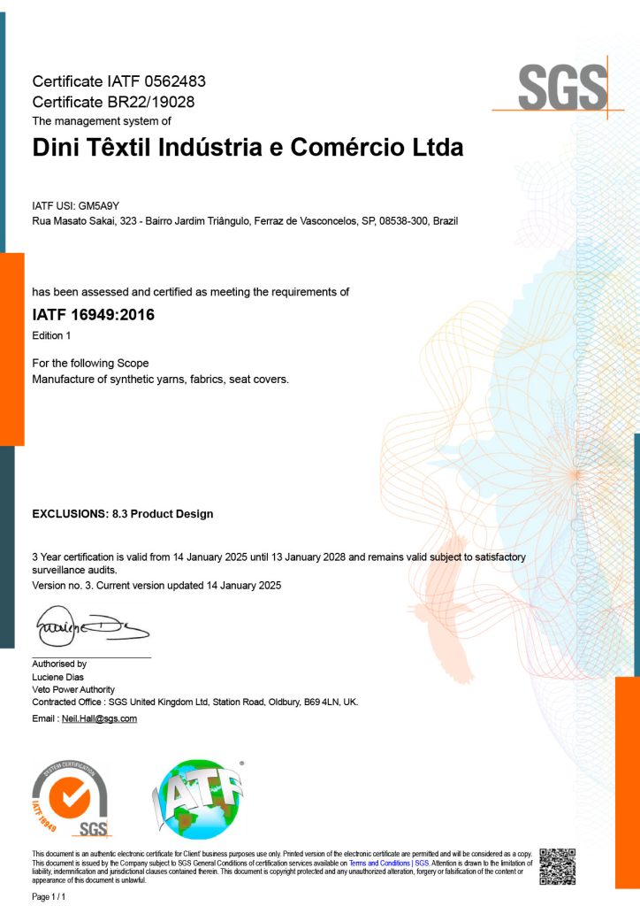 A Dini Têxtil tem o orgulho de ser uma empresa certificada nas normas ISO 9001:2015, IATF 16949:2016 e ISO 14001:2015.